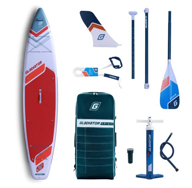 В коробке с SUP доской Gladiator Origin 12’6T есть все необходимое - вместительная транспортировочная сумка, качественный насос двойного действия, лиш с карабинами, разборное весло из фибергласса с нейлоновой лопастью и ремкомплект.